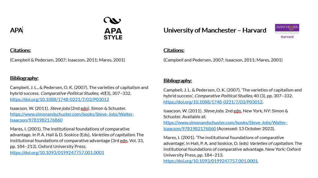 Some details that set the UoM-Harvard style apart from others: the way authors’ names are written in the reference list (standard upper and lower case rather than all capital letters), specific punctuation rules for titles and editions, and particular conventions regarding “Available at:” and “(Accessed:)” for online sources.