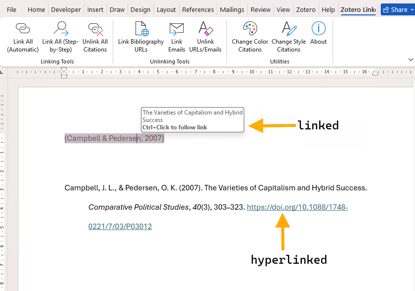 ZoteroCiteLinker automatically created the link between the citation and the bibliography and formatted the DOI in the bibliography itself as a clickable URL.