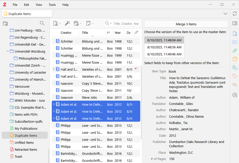 Wichtig: Nicht löschen – zusammenführen. Nur so bleibt Zotero konsistent. Die hauseigene Zotero Duplikatserkennung ist mittlerweile mit Zotero in Version 7 sehr gut. Alternative kann aber auch das Plugin Zoplicate genutzt werden.